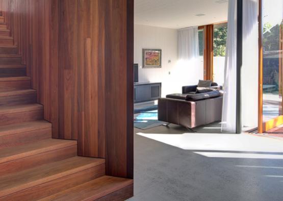 Timber is featured throughout – most notably inside where a sculptural stairway of grey ironbark features on every level.