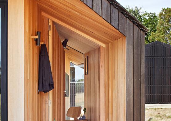 Spotted gum decking boards were used as the exterior cladding for the addition, lining the entire exterior in timber. Small gaps between the boards punctuate the exterior shell, creating a lighter visual flow through the singular material.