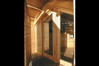 To make opening the pivot door easier in the exposed island location, it has been designed with spacings to allow the coastal winds to pass through the graduated oak boards. Glazing above the door prevents swallows taking up residence in the lobby roof purlins.