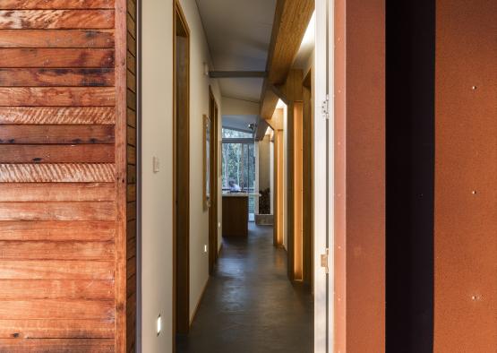 The entire western wall is clad in recycled Blackbutt cladding. The application of this cladding allows the house to blend into its bushland setting, reduces its visual impact in a sensitive setting and enables the landscape to shine. In addition, the construction of the double skin timber wall to the west improves the thermal efficiency of the home.