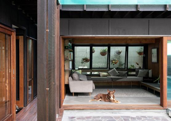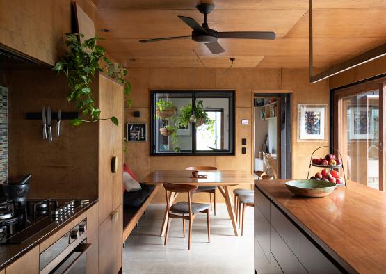 The refined plywood interior acts as a counterpoint to the rustic reclaimed hardwood outside, while the darker stain provides respite from the harsh Brisbane glare.