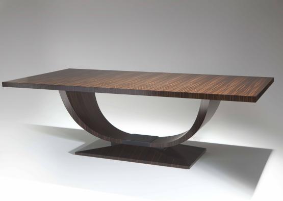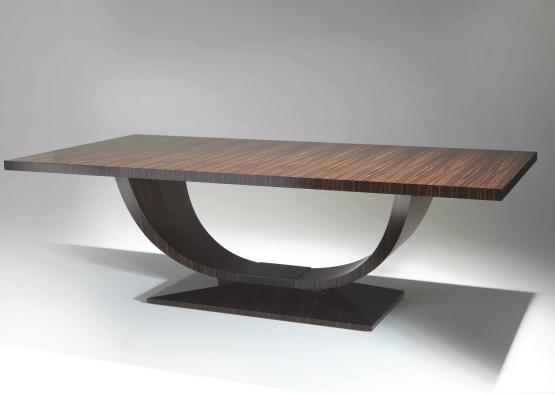 This dining table top incorporated macassar ebony veneer and techniglue epoxy resin R60 over 15mm birch ply. The birch ply, chosen because of its hard surface, is high-quality and retains its flatness, helping the dining table top resist indentation over its lifetime. The birch ply was made in to a torsion box creating a light weight top with structural integrity. The foot was made from quarter sawn macassar ebony veneer over a solid Victorian ash substrate. The base was made from seven layers of 6mm bendy ply and 2x2mm hoop ply skins for the face and back of the curved section. The table was finished with Mirotone precatalysed lacquer.