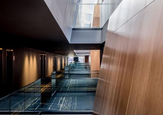 Internally, timber cladding was chosen to give ‘life’ and a natural aesthetic to building. Plywood is a major feature, along with Tasmanian oak flooring and black tiling. A large central atrium towers up the middle of the structure, allowing light to overflow through the expanse and open up the space with high volumes. A large raking duct cover offers drama and scale to the public corridor. Tasmanian oak veneer ply forms the cladding for the void.
