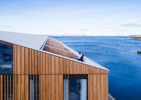 The design concept of Mac 01, by Circa Morris Nunn, was to create a ‘re-purposed warehouse’ to reflect the historic location and vernacular of the wharf area it’s situated in. The gently pitched timber structure perches out over the wharf, standing proud as a modern, innovative form, but presenting as a product of the wharf's nautical history. Sizeable cutout sections have been made in the roof to create outdoor balconies for the rooms, maximising views and outdoor space.
