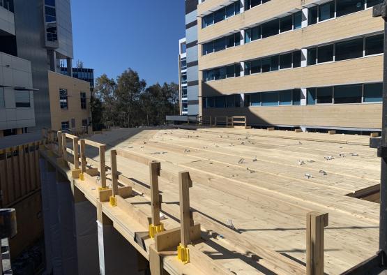 The project necessitated fire-rating requirements for a Class 9 building, including the over sizing of all beams and columns by 30% over the required structural integrity, in order to accommodate a charring layer. Timber reacts very differently to steel and concrete under fire exposure, forming a protective char layer that temporarily protects the member from burning. This was also taken into consideration with all CLT floors, whereas structural timber walls are to be covered with a fire rated plasterboard.