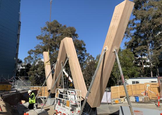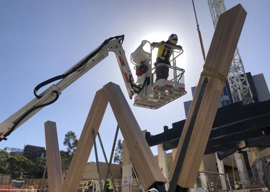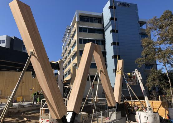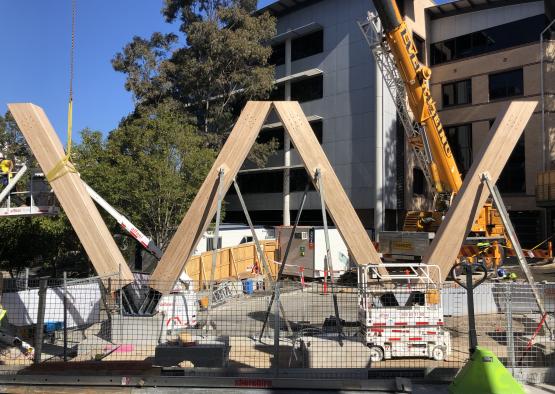The external ‘W’ columns are Victorian Ash Glulam, which has been locally sourced from Victoria. The Australian Mass Timber industry is burgeoning, but is still in a development phase. Certain mass timber products are in high demand or still unavailable in Australia, so all other elements for MUCEB were sourced from the Binderholz factory in Austria.