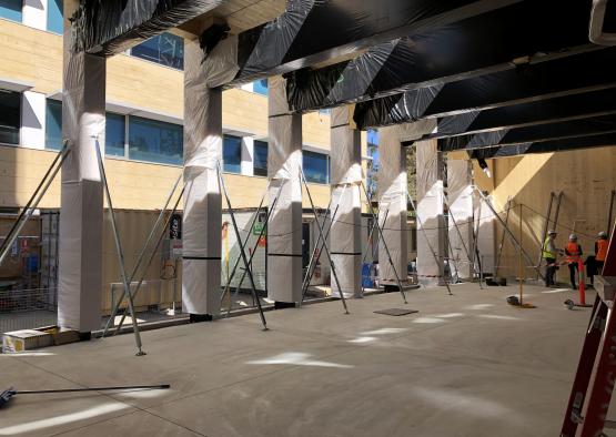 MUCEB uses a mixture of mass timber elements for its structural system. Unlike many hybrid timber projects, the only concrete used for MUCEB was in the ground floor slab. Spruce Glued Laminated Timber (Glulam) has been used for columns and beams. Cross Laminated Timber (CLT) has been used on all floors from level one, as well as all core walls (including lift shafts).