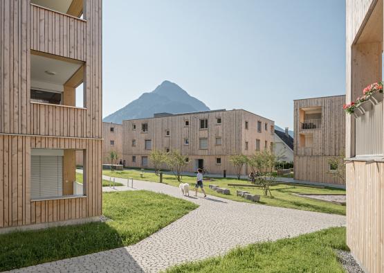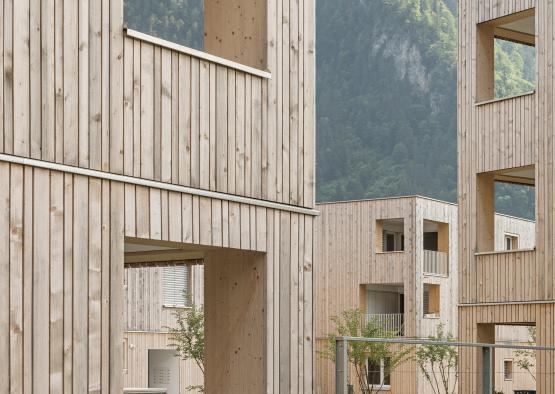 Maierhof uses a unique timber-based hybrid construction system for its structure. Pre-fabricated timber box beams form the main structural elements of the cubes.