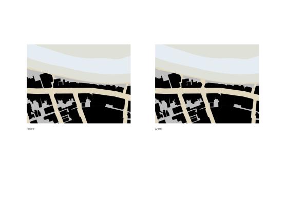 Monolithic brick walls hold up a timber roof canopy, creating not only a sculptural thoroughfare to access the river, but a covered public shelter.