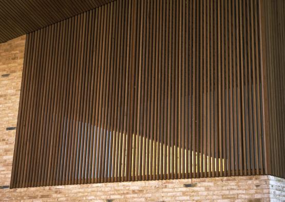 Timber battens allow light to filter through the structure, and provide a textural quality, while breaking up the monolithic form. Triangular battens, modelled off warehouse construction, allow for a clearer view out, and a more private view in.