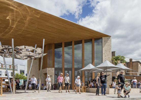 The timber for the canopy was chosen to relate to the context, and provide a warmth and human scale. Being a naturally sensitive area of the town, timber provided a lightness and natural feel that sat well in the site. Solid Blackbutt timber clads the interiors and roof, while a custom interlocking system clads the exterior.