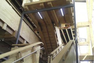 All of the structural beams and columns in the NMIT Arts & Media building are of Laminated Veneer Lumber (LVL), manufactured specifically for the project by Nelson Pine Industries Ltd. Similarly, the shear walls and floor panels utilise LVL as the base material.