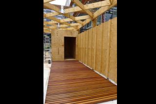 The idea of a timber aesthetic is explored within the pavilion design - the large scale sections of the recycled ‘traditional’ hardwood frames contrast the precisely engineered LVL ‘diagrid’ pergola and LVL storage box with its dovetailed jointed corners.