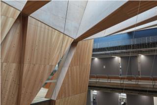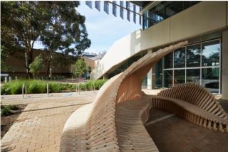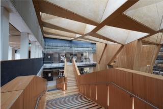 Laminated veneered lumber (LVL) and advanced prefabrication techniques used to construct a new education facility, the Melbourne School of Design, at The University of Melbourne.