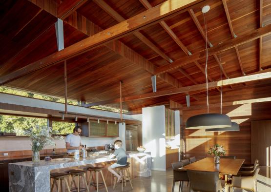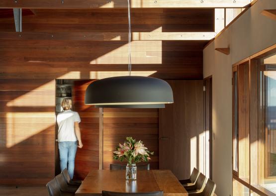 The structure is left exposed, with the thermal barrier outside it, celebrating both the construction of the building and the beauty of the material. The ironbark trusses soar above, forming high level clerestory windows that give volume, light and sun to the space.
