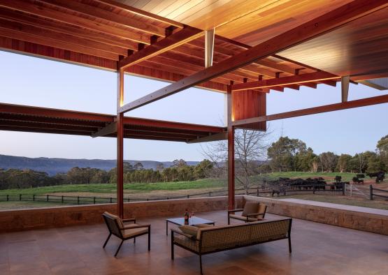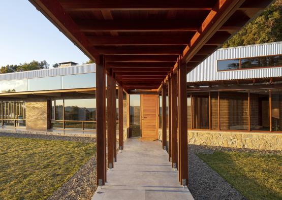A colonnade forms a grand link between private and public elements of the home, using the same exposed ironbark structural system as the dwelling that greets the occupants either side.