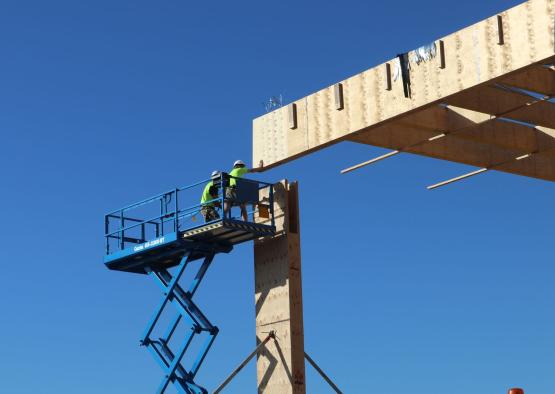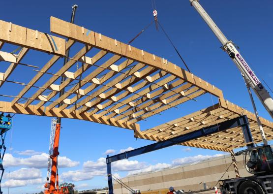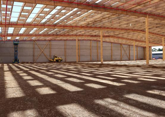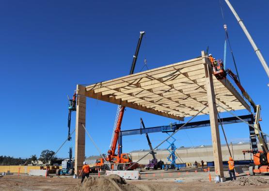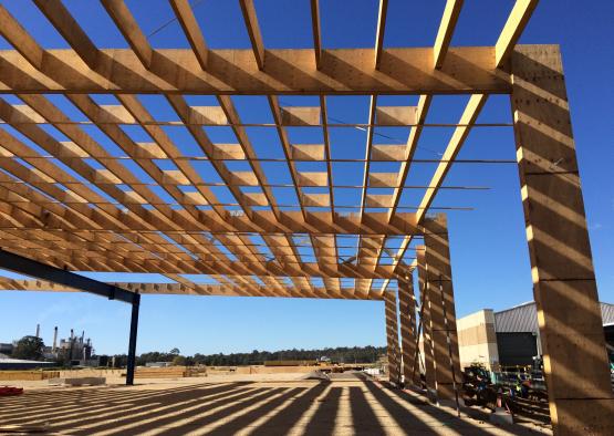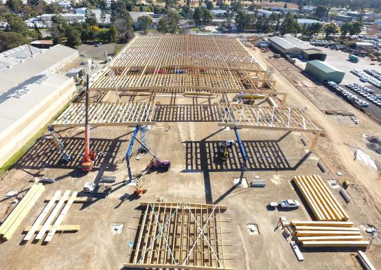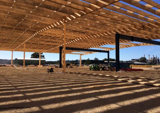 The 20,000 square meter warehouse is constructed using typical warehouse portal framing, but with mass timber as the primary material.