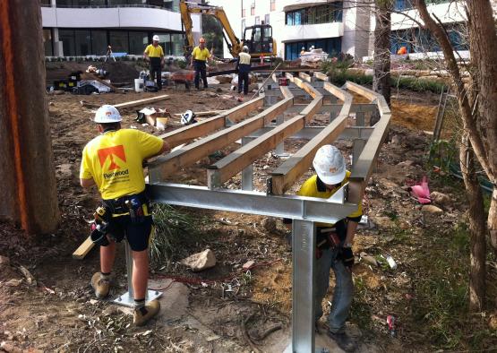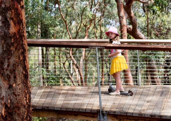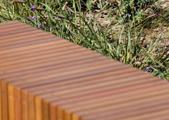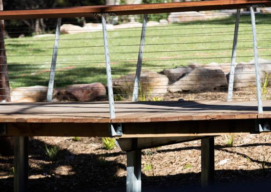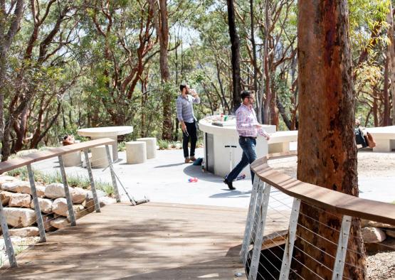 Timber was the perfect fit as it responded to the bushland setting, while connecting the various spaces of the landscape. The blackbutt used will age and adapt to the environs creating a subtle transition and bringing the forest closer still. The timber handrails and furniture present the user with a tactile and comfortable interface with the landscape.