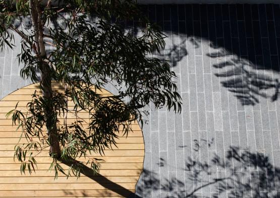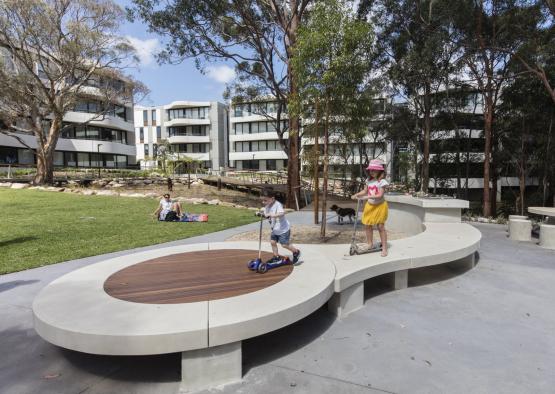 On the edge of Lane Cove National Park, Arcadia’s landscape for Shout Ridge responds to and respects the ancient landscape. The bushland setting provided an existing set of environs that allowed us to weave timber elements seamlessly into the landscape design. A feature of the landscape is the elevated blackbutt timber boardwalk, which weaves through the existing trees providing connections whilst protecting existing native grasses and landscape on the woodland floor. Filtered views from the apartments at Shout Ridge are dominated by the trunk effects of the Angophora dominant upper-slope shrubland adjacent to the site, and the use of timber in seating and handrails provides a cohesive design element that connects the various spaces of the landscape. Responsible material selection was an element which contributed to Shout Ridge becoming the first residential project to be awarded a 6-Star Green Star – Multi Unit Residential Design v1 certified rating in Australia.
