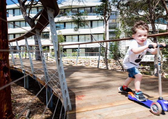 The creation of a sustainable community was a priority for Shout Ridge and to support this more than 25 per cent of the total site area has been developed for outdoor communal use, capitalising on its enviable Lane Cove National Park aspect. The bushland location presented unique opportunities and constraints for the landscape design approach which has integrated these iconic elements to protect and enhance the site character. Timber was used throughout the landscape to highlight the retention of many significant existing trees and complement the bushland planting palette made up exclusively of endemic species to the Lane Cove National Park. Carefully positioned into the existing landscape are a series of outdoor rooms for passive recreational use. These spaces adapt to the existing topography, with materials carefully selected to ensure the natural landscape feels like it creeps right up the building edge while providing separation and privacy from a user’s perspective. This includes elevated pedestrian connections, including the feature timber boardwalk, that weave through the existing trees, outdoor dining and cooking facilities, a community garden with composting facilities and worm farm, open landscaped areas for active play and seating areas in quiet zones, with access to sun and shade.