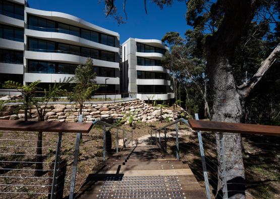 Timber use in this location is especially responsive to the context and setting. The elements used perfectly complement the existing natural elements on the site including native trees, indigenous flora, rocky outcrops and ravine like watercourses. The communal space outlook includes sandstone outcrops and tree trunk features, with scribbly gum, angophora, old man banksia and acacias all visible. The balance of materials throughout the spaces was carefully considered to achieve the appropriate character.