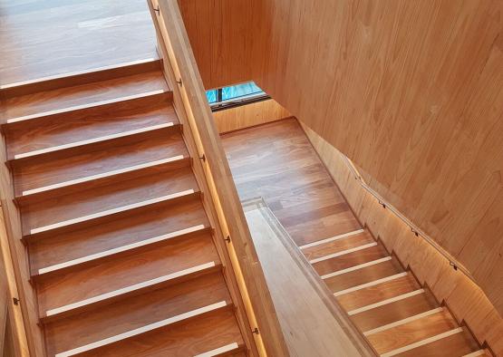 Mass timber glulam beams span over 11m to support the raked roof profile. The glulam beams have exceptional strength and spanning abilities due to their multiple timber plys. Timber risers for the stair were also made from heavy duty glulam. The risers each weigh 7 tonnes, and were craned into the structure at level 8 before being eased into place by temp lifting beams.