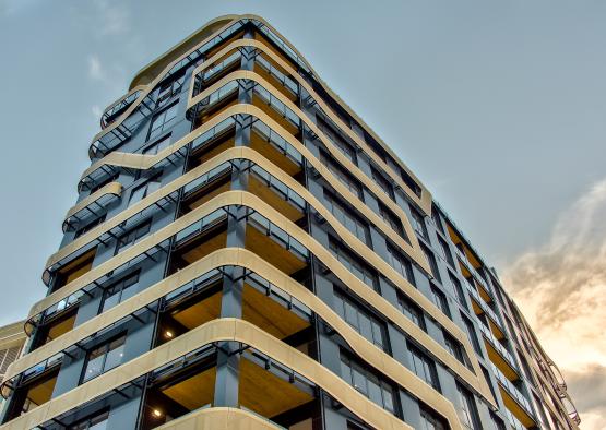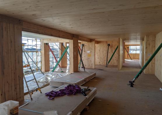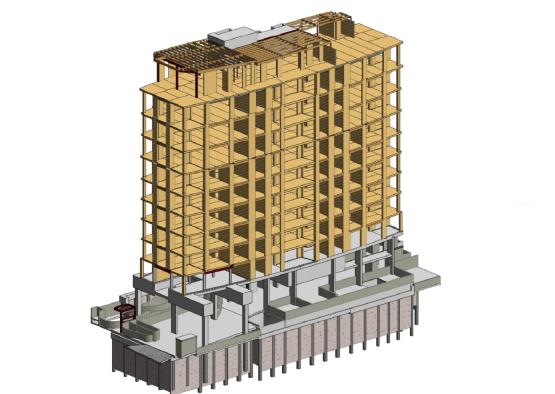 Monterey uses a hybrid structural system, made up of multiple structural materials. The foundational basement structure is made of concrete, taking the load of the floors above. Concrete columns and beams then support a concrete transfer slab on the ground floor, which creates a sturdy base for the remaining mass timber apartment levels. CLT walls, glue laminated timber beams and CLT floor plates make up the mass timber floors.