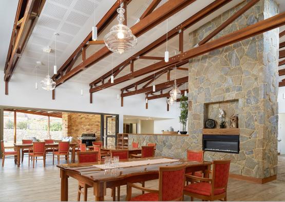 Large recycled structural beams, columns and trusses piece together gradually and sequentially creating a repetition and rhythm to the internal atmosphere. A timber ceiling wraps from a datum along the wall to create a wave of warmth overhead, enhancing a sense of wellness and home for the residents.