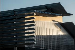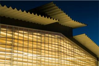 A stretched ‘lantern’ at night, the building’s edges open with ventilation ‘gills’ to allow views directly into the competition arena. The combination of operable structures (such as timber louvers), angled blade walls and light-diffusing materials help to prevent direct sunlight and glare interfering with play, while enabling 100% natural ventilation to all six courts.