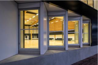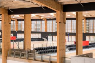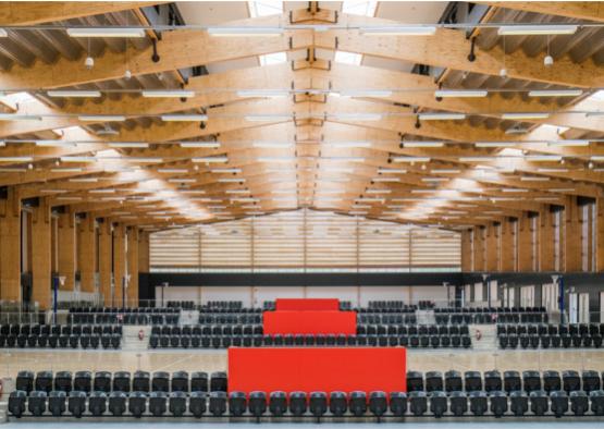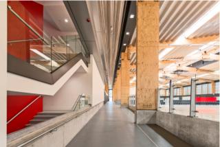 The industrial aesthetic of the LVL is complemented with the polished warmth of the sprawling timber sprung flooring. These timber elements, together with the raw materiality of concrete and translucent polycarbonate and the neutral colour palette of metal and plasterboard linings, form a backdrop for selective red elements forming jewel-like focal points.