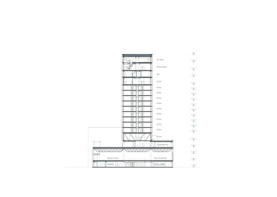 The wooden façade of the 18-story hotel is covered in glass, reflecting the shifts of the sky and giving the impression that the building floats lightly above the cultural centre.