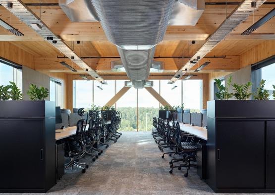 The K-braces form both the overarching design language and the structural rigidity of the office building. The repetitive, modular floors consist of load bearing CLT perimeter walls, aided by glulam columns and beams, supporting CLT floor plates. The K-braces are used for lateral stability of the frame, and are left exposed throughout.