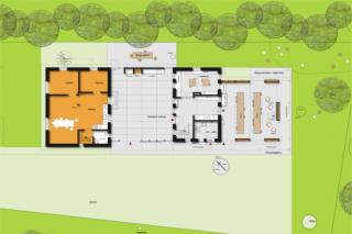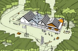 The exterior of the houses prioritises the transition from the Culture House into the forest, as it still functions as rest stop and coordination space for visitors to the forest. The new structures mimic the rustic lines of the original guards buildings, with highly peaked gables and very simple lines. The continuation of the roof shapes over the now connected buildings makes a jagged concertina that stands out starkly against the forest background.