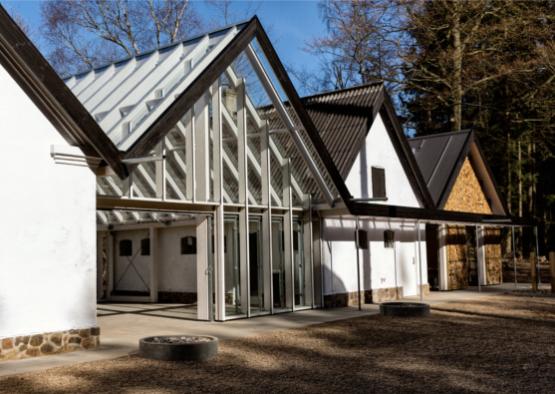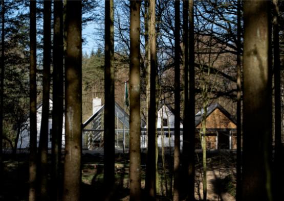 Providing a gateway into the lush forests of the Jutland highlands in Denmark, the Nøjkærhus Culture House comprises of two old forest guard buildings with two new buildings built around them to create a single, larger structure made up of four distinct spaces. They are known as the Main House, Glass House, Stable House and Log House.