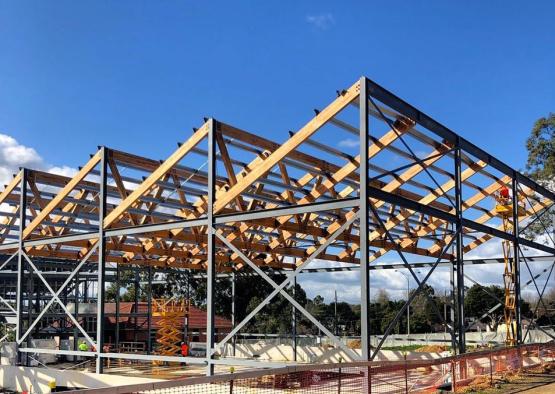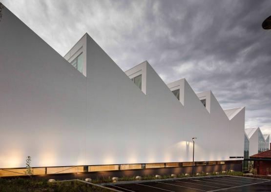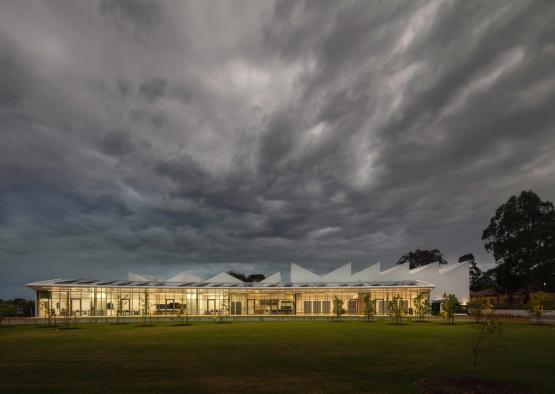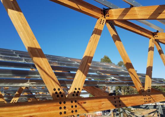 The striking sawtooth roof of the building is made from glue-laminated timber (GLT) trusses. The GLT trusses are made of Victorian ash hardwood, which is a durable timber, and thus remains exposed in the final design. GLT is made from thinner profiles of timber glued together to create a mass timber element, with increased strength to a regular beam.