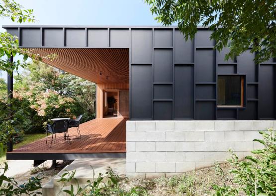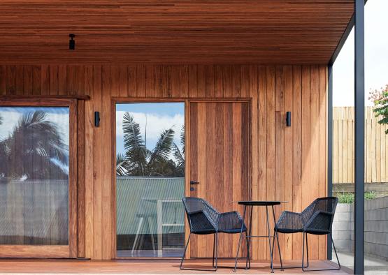 The warm timber deck lining contrasts with the dark exterior cladding, to create a peaceful and welcoming exterior environment.