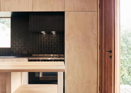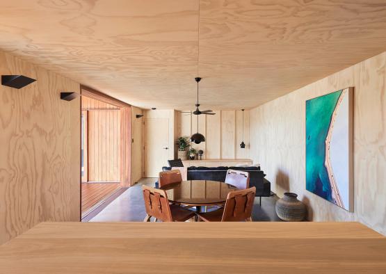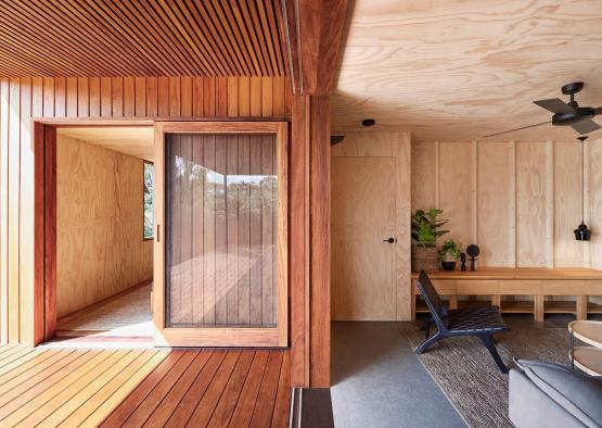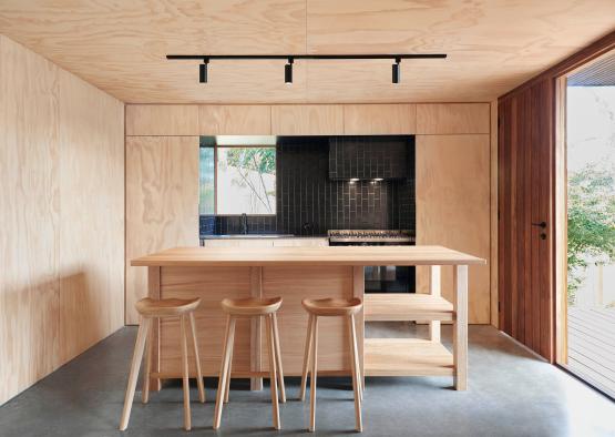 The plywood lining is natural and light, providing visual clarity throughout the space, and reflecting the suns rays. The ceilings were reduced to 2400mm to fit a standard FC and plywood sheet.