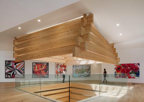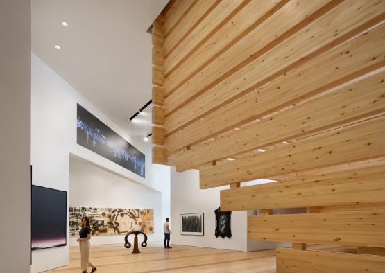 The atrium is able to be viewed from every floor, and creates an interesting link between floors, and an aesthetic juncture along the levels. The timber stack becomes a unique sculptural piece of its own in the centre of the exhibition space.