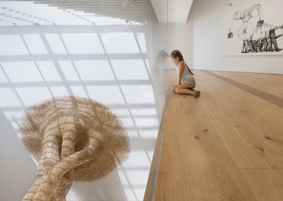 The interior spaces are mostly defined by white walls and oak timber floorboards. Interior volumes vary depending on the exhibition space required, and large void spaces are created by the offset stacking of volumes. Irregular shaped spaces are generated by the stacking, creating unique and surprising spaces.