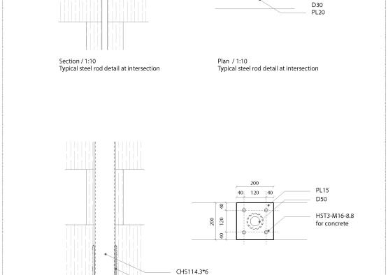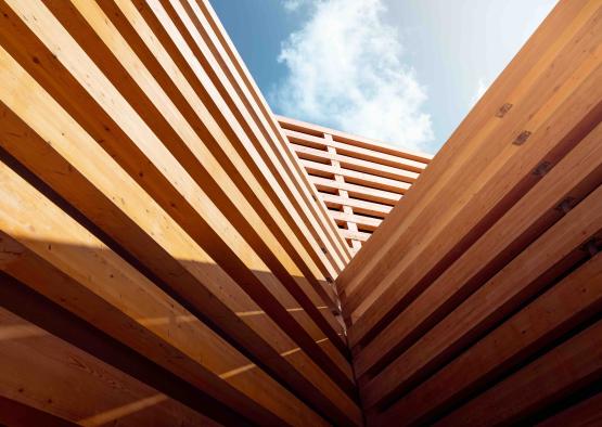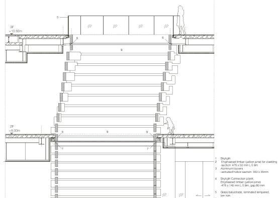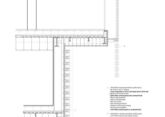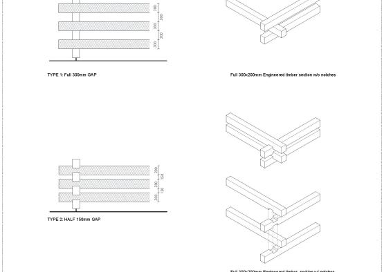 The structural system uses engineered mass timber beams in a stacked effect to create a simple layered system. The 300mm section beams use two different joinery techniques. Some of the beams are laid flat on top of each other, leaving a full 300mm gap between beams. Other beams are notched 75mm into their neighbouring perpendicular beams, leaving only a 150mm gap. Steel rods are inserted into the connections for stability, and have been capped with wooden plugs.