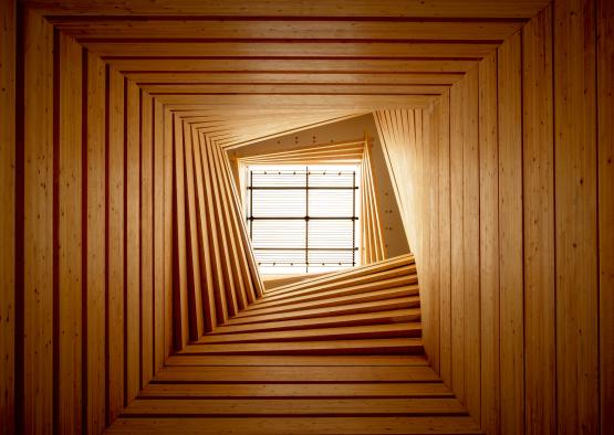 The most striking feature of the interior of OMM is the staggered timber atrium. The stacked beam effect is continued into the atrium, but the stack is offset to create a warped optical illusion.