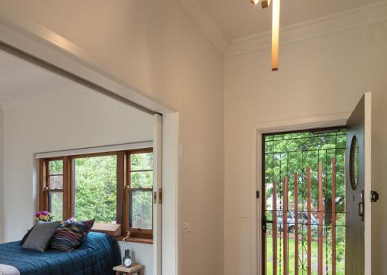 A custom timber canopy light is the focal point of the entry way, continuing the referencing of the tree branch. Tasmanian oak is the star of the show, with T&G boards used for the floor surface, and veneer used extensively for joinery. The joinery also contains moments of the branch motif in its handles, and coupled with pale white terrazzo and white tiling, a simple colour profile is displayed. The crown cut veneer’s distinct grain pattern extends the flooring up into the bench top, subtly directing focal points around the house.
