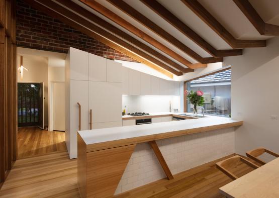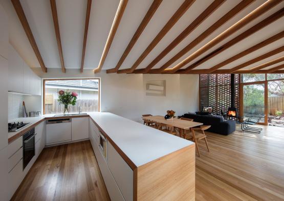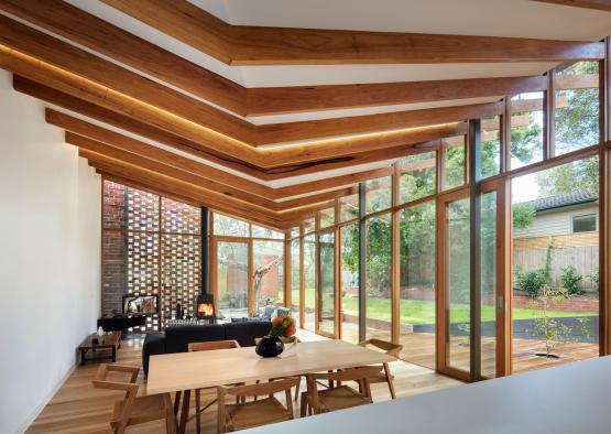 The gesture of mimicking the prized Mallee redgum informs the mood of the open plan living space. Branch-like timber beams form a rhythmic pattern above, referencing the canopy of the surrounding eucalypts. The rhythm flows down to timber mullions and on to the expansive deck that looks out to the garden. The shape of the roof form takes direct influence from the split branch shape of Ol Be-al, mirroring the form when viewed from the garden. Lighting is carefully recessed in amongst the beams, creating an uninterrupted pattern above.