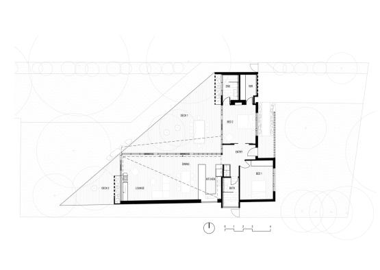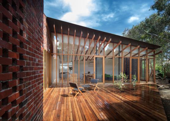 Two triangular hardwood decks in the backyard create outdoor spaces that can be occupied simultaneously with privacy. They provide a warm contrast to the red exterior clinker brick, and settle the house amongst the eucalypts. Circular cut outs in the decks allow new growth trees to populate the deck, eventually providing increased shading to the north facing living space.