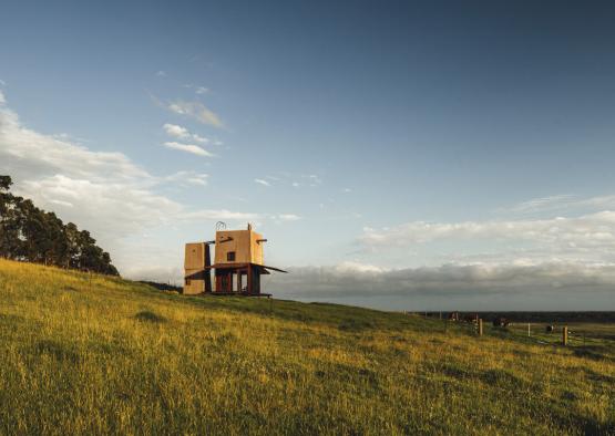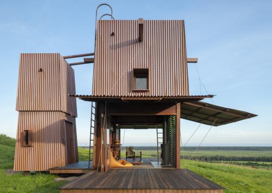 Casey Brown’s second ‘Permanent Camping’ structure comprises two ironbark-framed, copper-clad towers that sit sculpturally in the vast rural landscape.