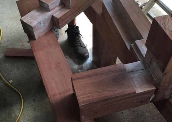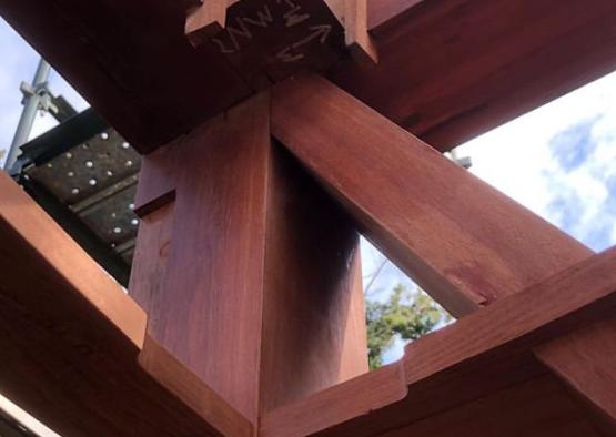 The structure was prefabricated in a nearby barn on site by master craftsman Jeffery Broadfield and the building team from Smith and Primmer. Fabrication involved complex traditional post and beam joints, joined without the aid of mechanical fixings. Traditional joinery like this has influenced modern digital techniques like CNC machines, which can be used to cut intricate joints in timber elements to join them.