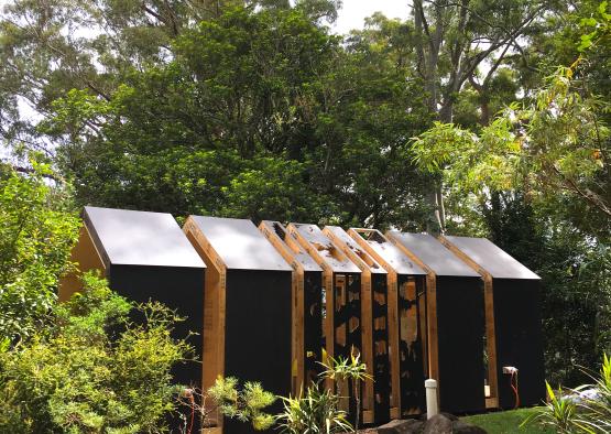 The form of the pavilion references the houses that were lost during the devastation of the fires. The archetypal ‘house’ shape is deconstructed and conveyed as a series of silhouettes. The black exteriors reinforce the notion of shadow, reminding visitors of the destruction of the fire, and the houses that were.