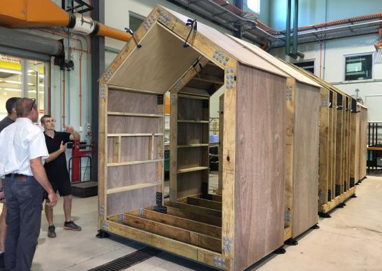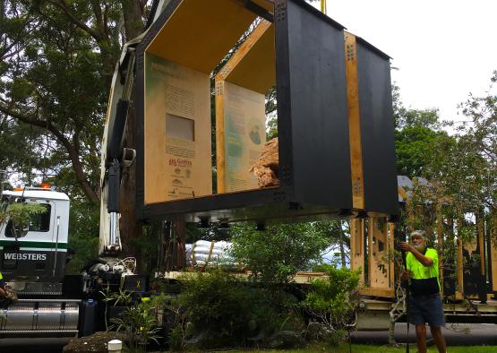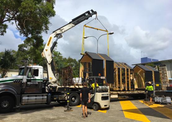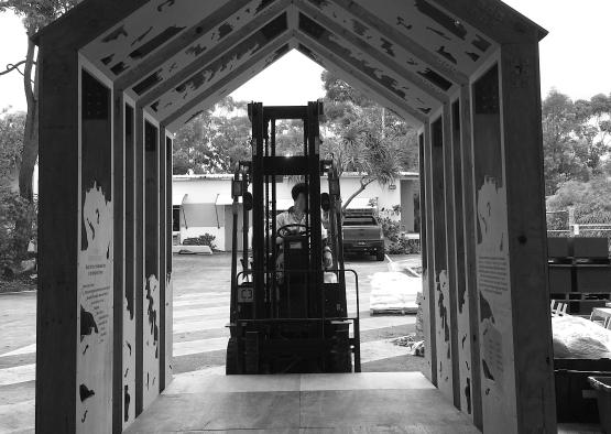 The structure was prefabricated in the Griffith University Engineering Laboratory. Despite appearing as eight individual elements, the segments consist of three modules. The modules are easily transported on the back of a truck, allowing the pavilion to tour. A ballast in the floor, along with simple steel footings, ensure maximum durability and stability as it is transported.