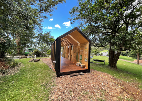 A segmented timber pavilion that supports community recovery, with stories of resilience etched into the architectural form.