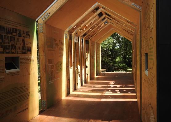 The middle section of the pavilion is laser-cut by a CNC machine with the shape of trees, expressing the incredible regeneration process that nature embarks on after a fire. The intricate shapes allow a filtered light to enter the space, creating different tree like patterns in the interior throughout the day.
